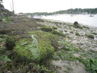 Low tide exposes some of the detritus heaped on the bottom from long use. It would be romantic to say centuries of dumping, but in fact the harbor was dredged around 1980 which effectively killed off most of the clams and a lot of other stuff. Anything there now is mostly rather recent, at least near the middle channel. Supposedly the good news is that Huntington can now host private yachts the size of ocean liners.