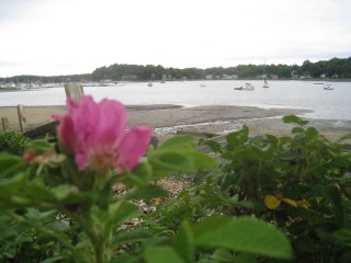 An unfocused beach rose frames the tidal flats, filled with clams which can no longer be harvested this far from the inlet due to pollution and tiny hermit crabs which come out each low tide to wave their claws in seeming protest at the sun. If you walk along the edge, you are likely to see horseshoe crabs flowing about in their ancient rituals.