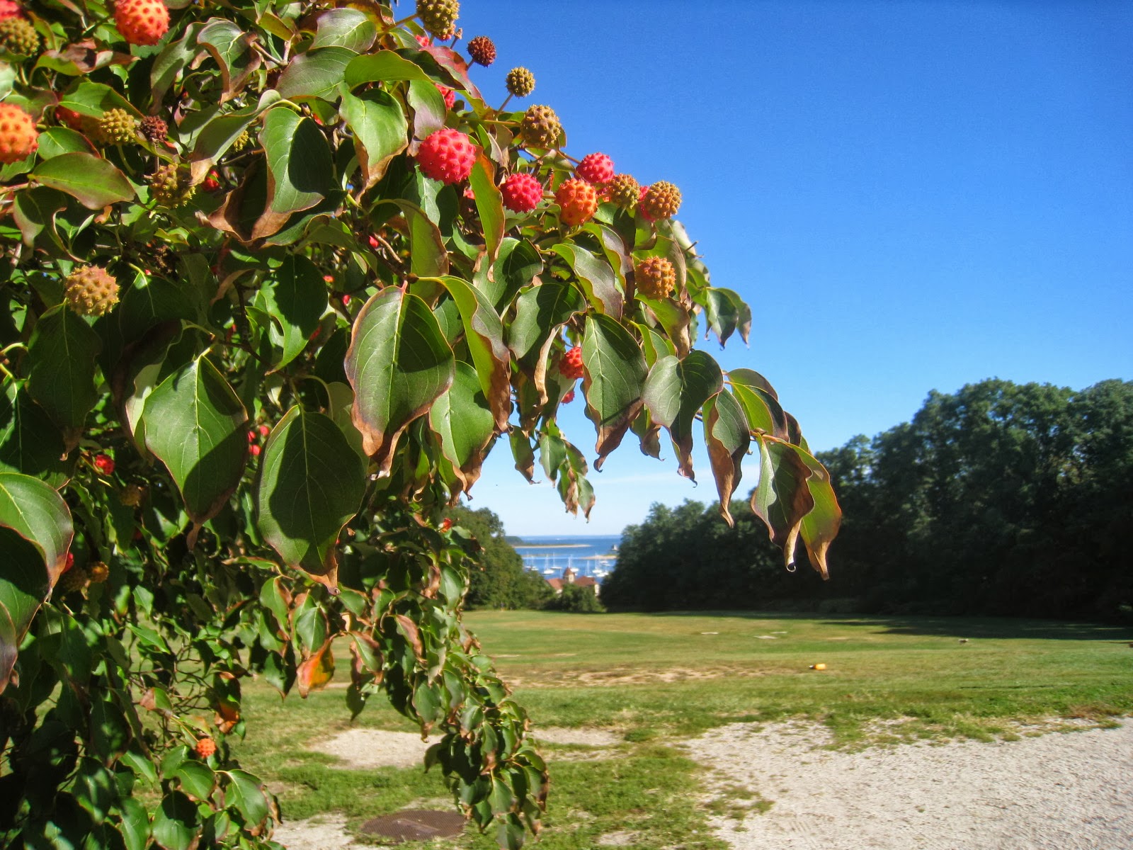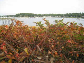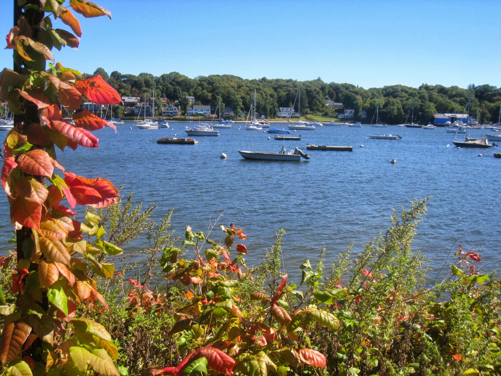 You need to go a little inland, not much, maybe a mile, to get some real reds and yellows. Even on the harbor. though, if you get up a few dozen feet from the water _ as in this shot along a bluff property _ you can get a little action. Yet, for the most part, all that will really become noticeable is the drying out.