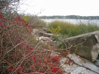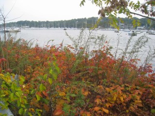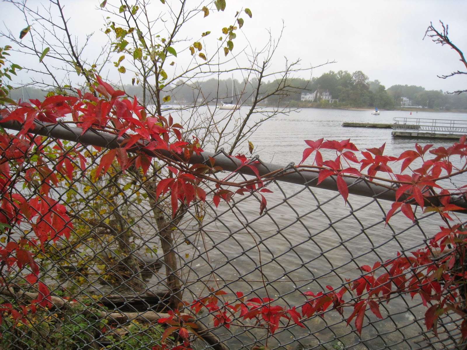 The next two weeks are peak colors around here, what there is of it along the harbor. The vines go first, like this one draped along a fence. The locusts are mostly bright yellow, everything else _ not so much. Upland a bit _ say at Hecksher park _ there are a few bursts of brilliance.