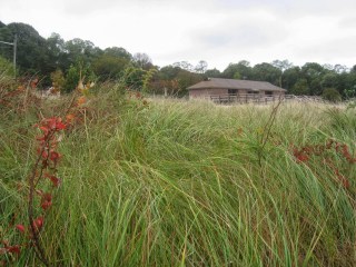 From the beach, through the grass, to the bathhouse on Gold Star Battalion beach. The restrooms are locked and the staff and life guards long gone, but the windows still need boarding up against winter storms. The big sandy stretch in front has been taken over by dogs and their owners.