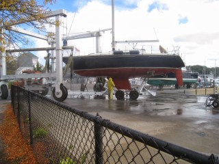Not everyone waits. There can be a long line to get into the dock and have something as large as this lifted out of the water, cleaned with pressure hoses, covered in white shrink-wrap, and slowly driven across West Shore Road to the large sand pit where it is safely stowed row on row. Unless, of course, a tree falls on it, but that’s a different story…