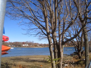 The tide goes in and out twice a day regardless of the weather, although the moon and a big storm may exaggerate its effect. Unlike the leaves, the colorful kayaks never fall off their perches, and lend a festive note to the acid clear blue and sharply etched branches in this Canadian air.