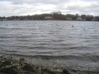 Low tide is beginning to have that bleak off-season look where the exposed sand bottom just kind of grades into the water, sky, and brown tress on the shore. Even the houses have lost their vibrancy, as all the flowers are gone and the festive outdoor detritus _ flags, barbeque sets, toys, whatever _ have been safely stowed away.
