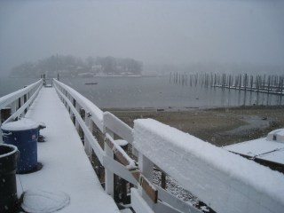 Not a heavy snowfall, but enough to make a difference. The opposite shore is obscured by a heavy band of flakes, as the dock takes on a new coat of white.