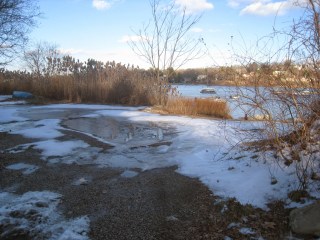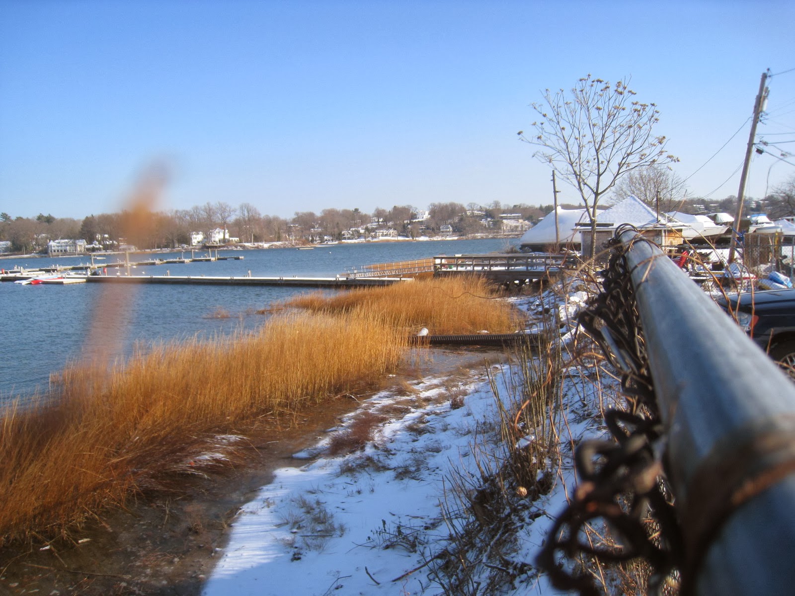 Although the harbor is clear, shallow puddles have frozen solid. The afternoon sun is bright, but dimmed by the atmosphere as it shines in from its most southernmost positions. Dead and dormant vegetation has not yet been broken or crushed by heavy storms.