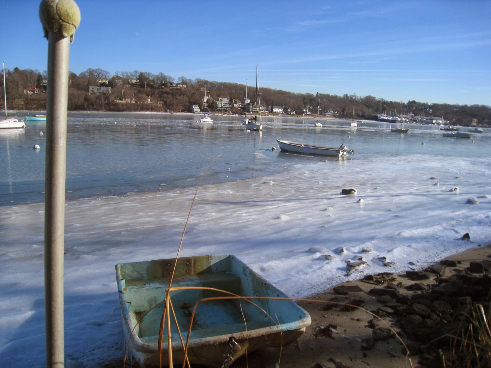 This boat probably won’t be going out today. I say probably because, like the rest of us, clammers can be crazy sometimes. If they need to get to their boat, they will, even if they have to chop their way. If you look closely, in the mid distance by the sailboat there are trails of a few who have already gone through.