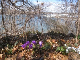 Patches of true spring are appearing everywhere now, although some of the more interesting ones may be hard to find. This view, for example, is hidden behind a low wall on East Shore Drive. Crocuses tend to colonize wherever they have been planted over the years, even though the use of the ground changes, and they remain blooming long after their original gardener has moved on or died.