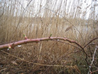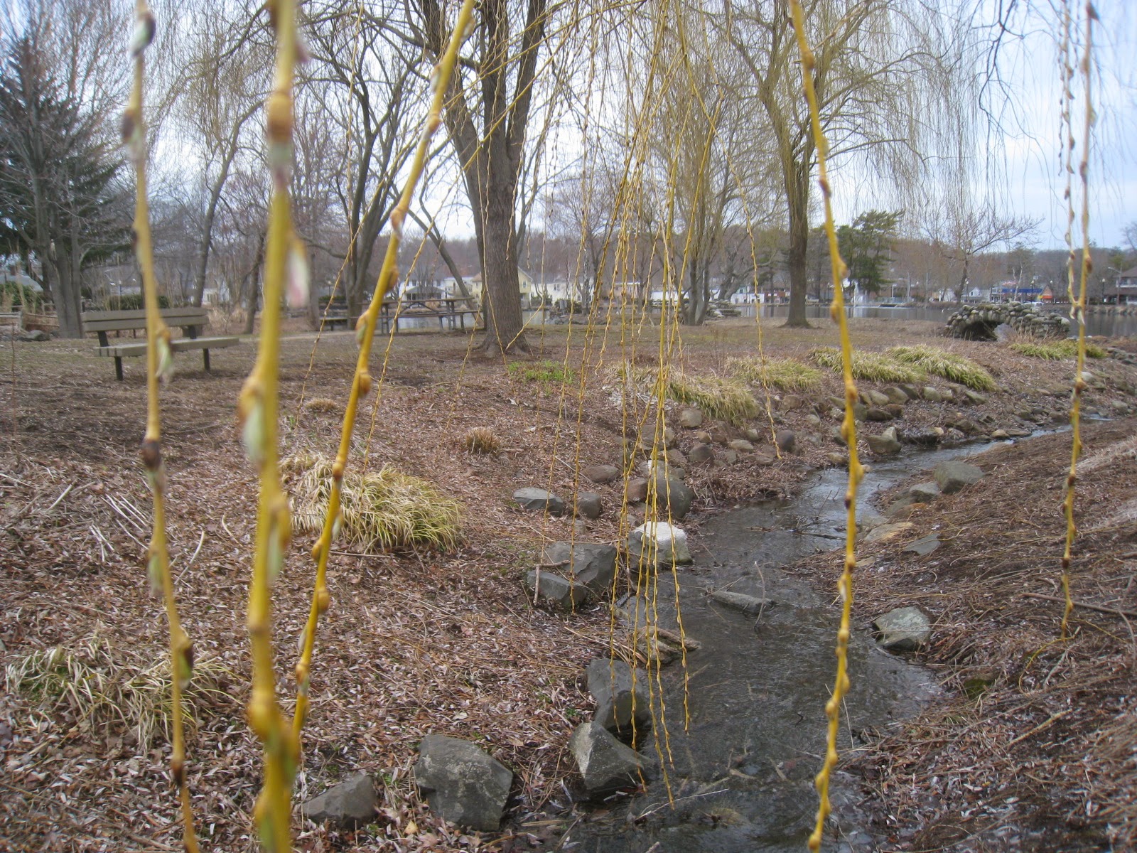 Willows are about two weeks behind. Even from a distance, you can see the branches brightening into a brownish green, and close up green shoots are starting to form the leaves for the year. Even the perennials along the little stream here at Hecksher park have some green tinges at their roots. Overall, even in this picture, the world seems brown and sleeping, but the alarm clock has gone off.