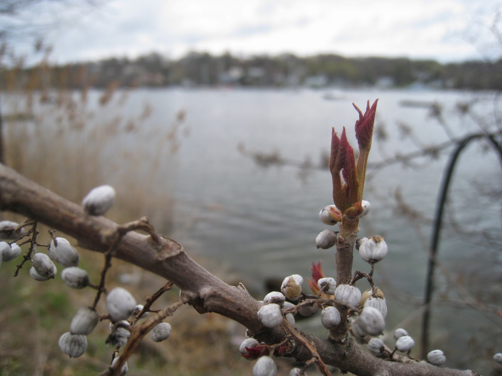 Blushes of red and green faintly halo the trees beyond the reeds. In a few days the crowns will fill in and branches will more or less disappear. The sky seems impossibly blue.