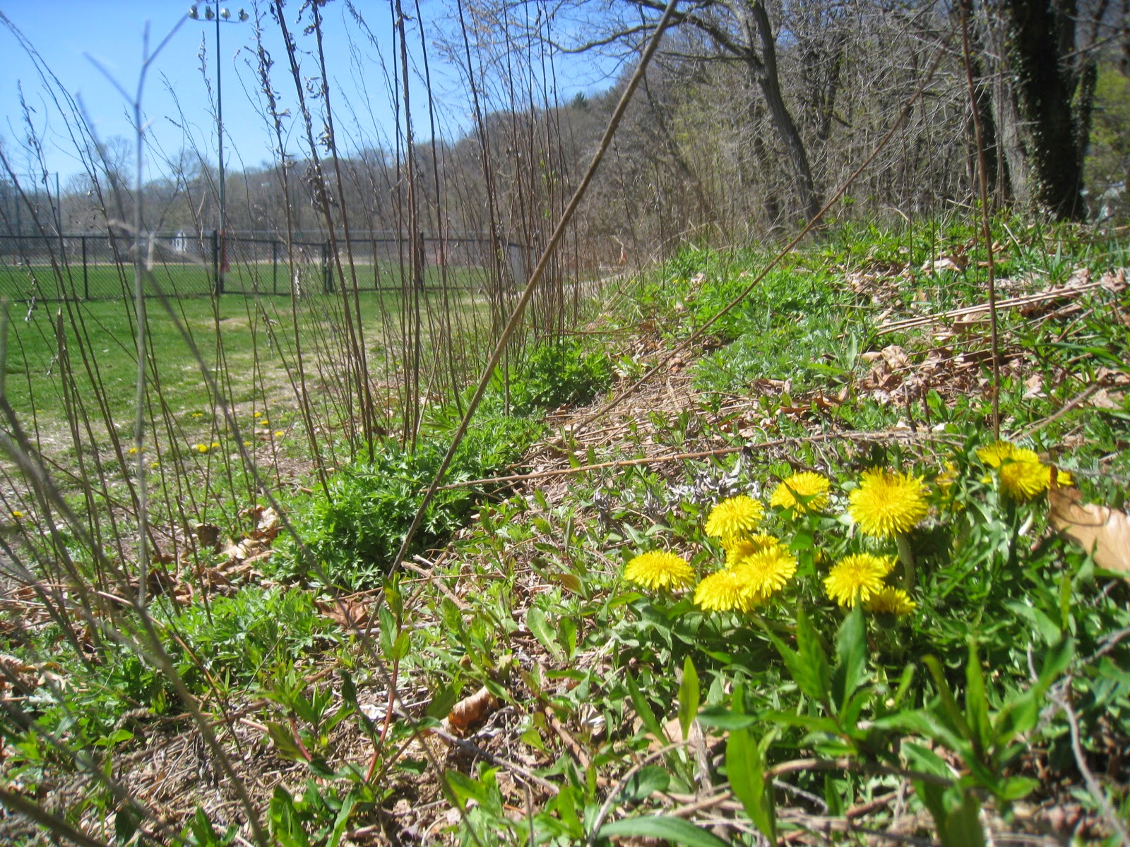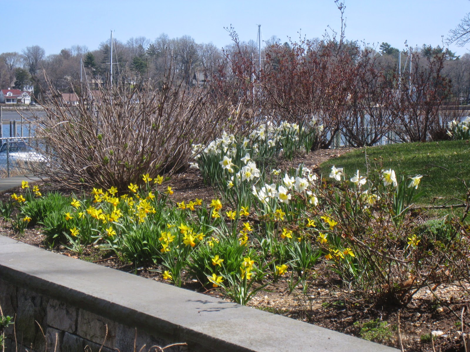 Still peekaboo through bare branches. In no time at all, the green world will close in, and there will simply be walls of vegetation making a glimpse of water or even sky difficult. Meanwhile, the spring bulbs take advantage of the fact that they have sunbeams to themselves for a little while. Well, also the insects of course, although knowing what we do about ecologies and their dense interconnections, you need to wonder if any of the imported species have actually met compatible pollinators over here.
