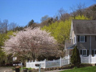 Wall Street goes along Mill Dam park tracing _ naturally _ the ancient wall that formerly surrounded the tidal mill pond itself. This section simply winds along the base of the sand dune heaped up by the receding glaciers. The sand for tens of thousands of years since has been gradually covered with a thin layer of topsoil, some of which naturally washes down, and you get a few pockets of decent fertility. This cherry tree is taking advantage of it.