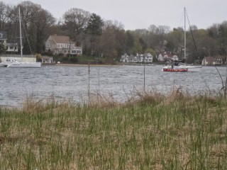 Coney’s marina has reactivated piloting yachts to their moorings in a little red gondola with orange bumpers along the side. The dune grass is well advanced. Still too cold for trees on the other side of the harbor to be joining into April.