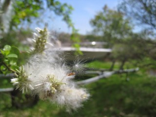 For a month now pollen has been causing us to sniffle and sneeze. Over the last few weeks at least insects have been busily flitting about. The results of some of that orgy of pollination are now visible day by day, as in these seeds blowing off merrily into the strong breeze.