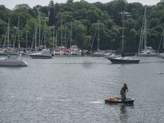 No, he is modern enough. This is simply the ferry from the motorboat to the shore. Like me, he uses muscles in the old ways to do traditional things, but within a framework of modernity _ electricity, internal combustion engines, plastic. We should not really give up one or the other completely, simply find a way to make them compatible and symbiotic. Like this scene.