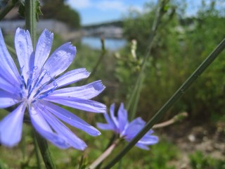 Common blue chicory now springing up everywhere. Almost as common as ragweed, growing in much the same places, its large pale flowers are another of the common wonders we often ignore because they are not grand and overwhelming and mysterious. Unless you actually look at them of course.