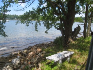 A quiet little bench in a grove along a pleasant shore, an old tree providing shade, a perfect place for meditation no matter the time and place. You can almost imagine Socrates or Lao Tzu contemplating the universe. Bodies of water, with their complex ever-changing fractal reflections and waves almost always evoke thoughts of the infinite.
