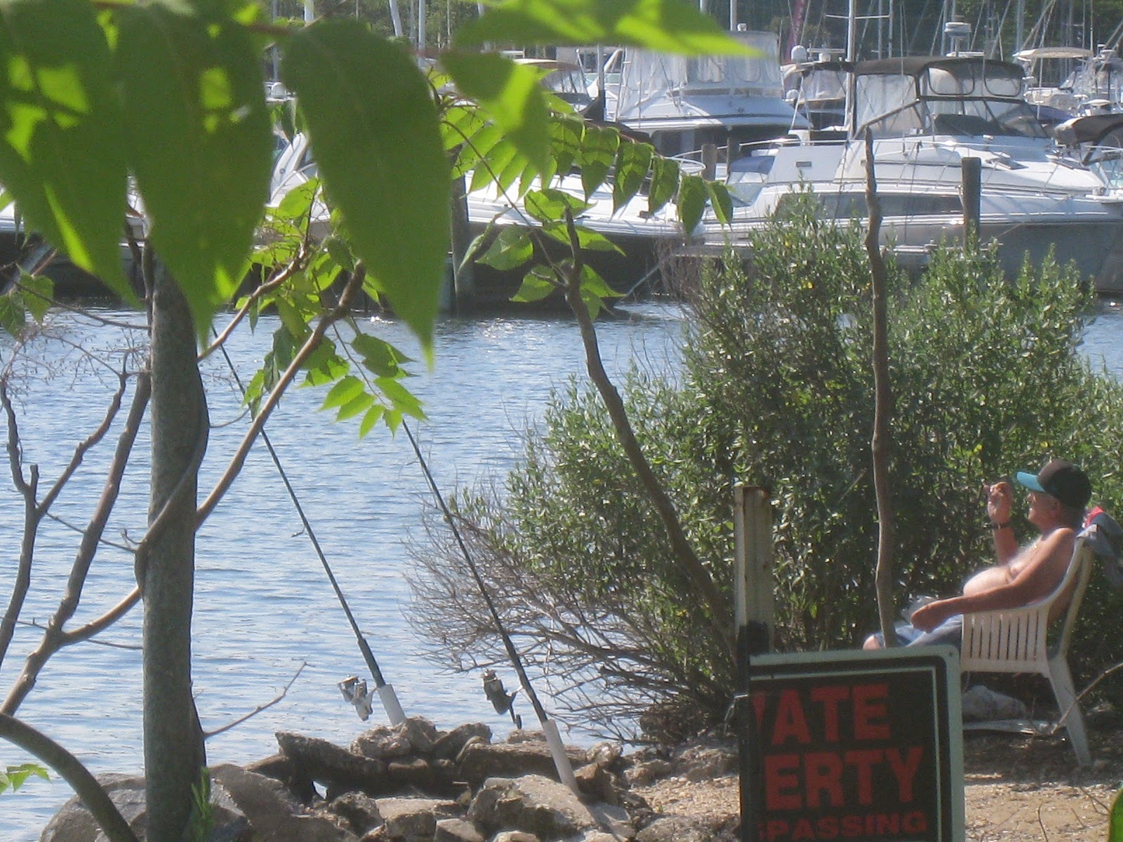 Old fat guy lurking in the bushes like an aged panther waiting for prey. At least, I guess he imagines prey. I’ve never seen anybody catch anything this far inside the harbor and discussions I’ve caught mostly spoke of imaginary flounder (not in this season) or inedible spider crabs. At this point, he is just a picturesque part of the scenery, like some ancient Italian peasant in a fishing village.