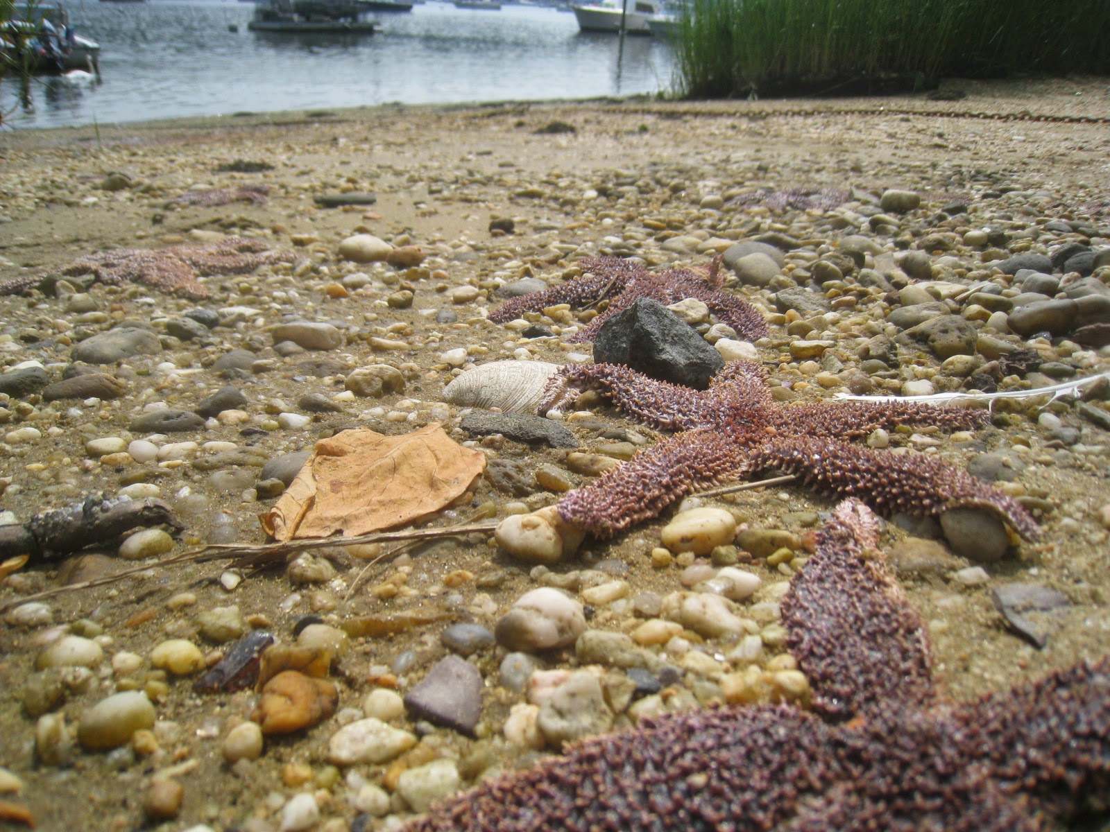 The hard-to-make-out starfish in the lower foreground here were probably dumped on this sand by some fisherman beaching his dingy. Starfish, eating the clams still harvested in these waters, are not welcomed by the local commercial baymen. Children delight in them, of course, and they intrigue us all being so different from everything we find familiar, but that does not prevent them from being pests. After all, mosquitoes are quite uniquely fascinating as well, in the abstract.