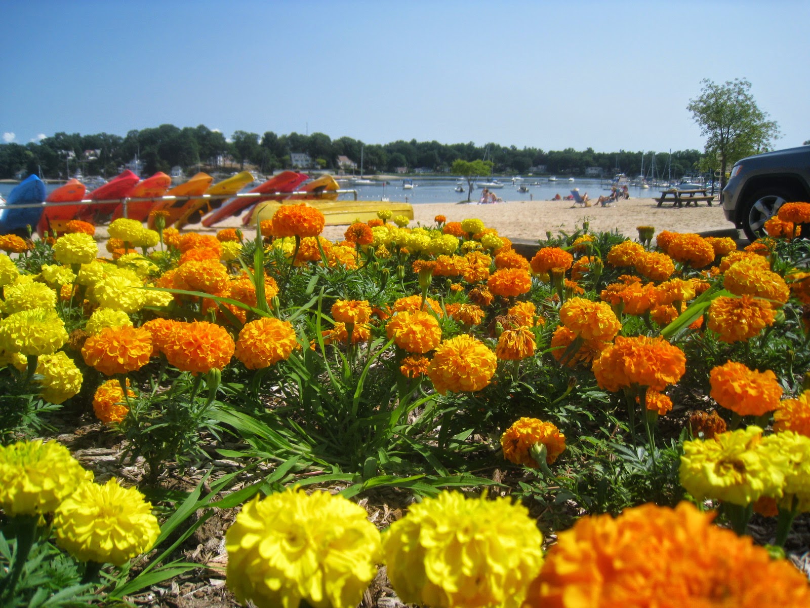 It’s easy enough to understand why we try to beautify bleak surroundings like city courtyards with colorful flowers and other ornaments. Yet our desire to add interest extends to views that are fully magnificent on their own. Lonely cabins looking over endless mountain vistas often have a patch of flowers nearby, and here on a beach with all the ingredients needed for an endless visual feast are beds of marigolds adding brilliance.