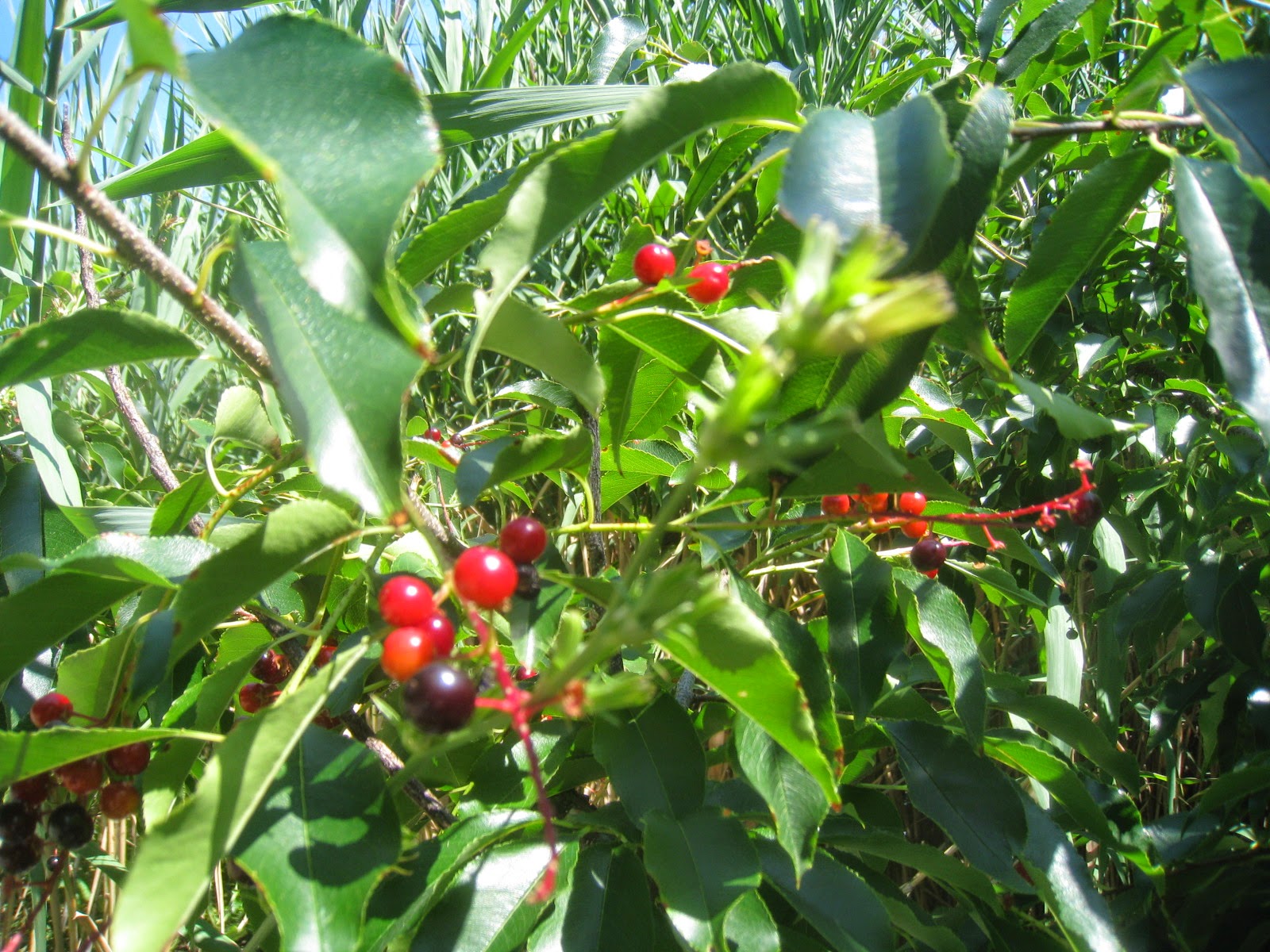 Bright berries almost hidden in the tall reeds. Even ignoring the infinite quantity and form of microscopic life that we can not see, each cubic foot of roadside (or any other surface) rewards long study with thoughts and meditations, if we wish. Of course, there is never enough time. And we always remember that such thoughts and meditations are merely fleeting electrical signals in our brain _ the berries certainly do not care how we judge them or their meaning.