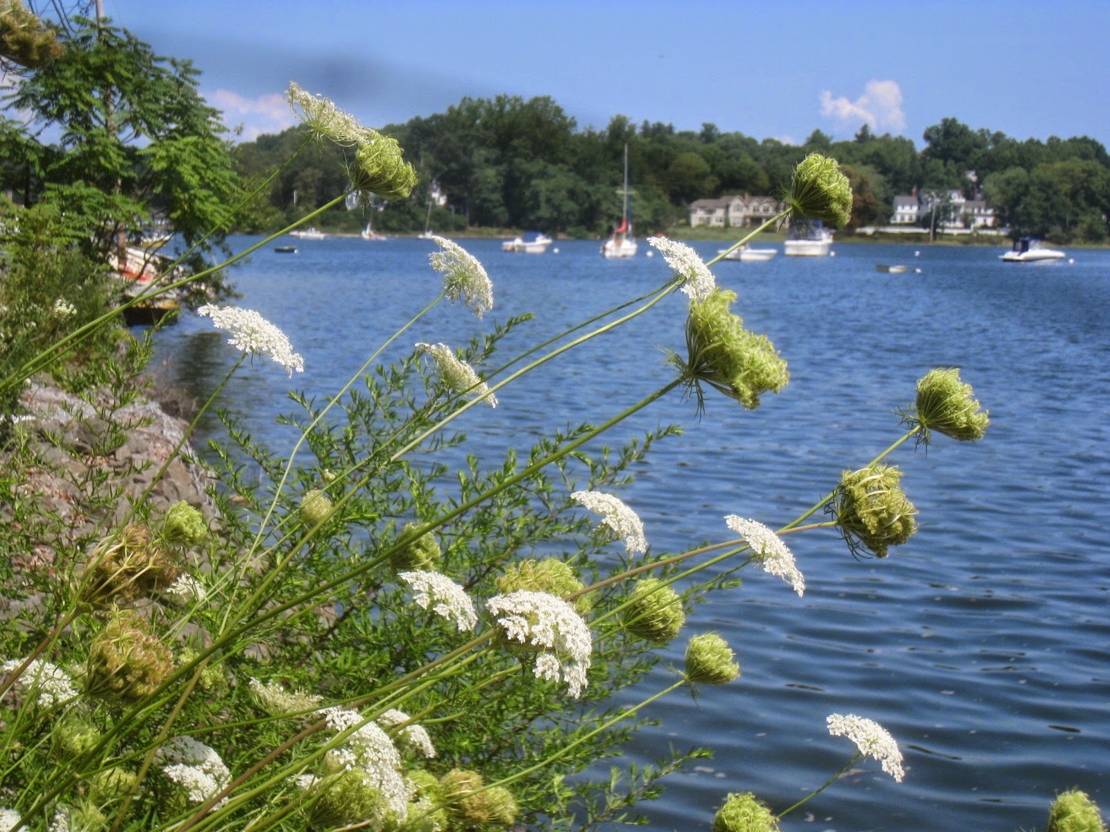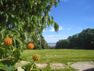 Strange spiky berries on the Japanese dogwood set off the long slope to Long Island Sound, lying beyond the harbor inlet. Somewhat cool for the season, but otherwise a perfect day, filled with sun and scents and insect calls and butterflies and swallows swooping about the lawn a foot off the grass. Ah, if we could just bottle this to pull it out in the depths of winter, when we need it most.