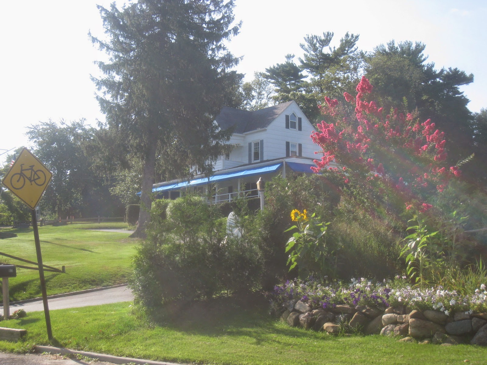 Early misty sunlight falls on the old yacht clubhouse on the hill. For those who can tell time with the progression of plants, this could be no other time of year. In this case, I think the ornamentals have improved on what would be here naturally. I know that is heretical, but I am not really a fan of naked nature wilderness _ I like civilization and its comforts, including beautiful landscaping.