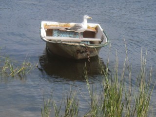 Gulls resemble some people I know, always sure of themselves, ready to grab whatever they run into as if they own it, smugly aloof from everything else happening around them. This one has commandeered a perch on a dory in the tide and would probably attack me if I tried to drive it off. Or, just as likely, say “The Hell with it,” and fly off without regret.