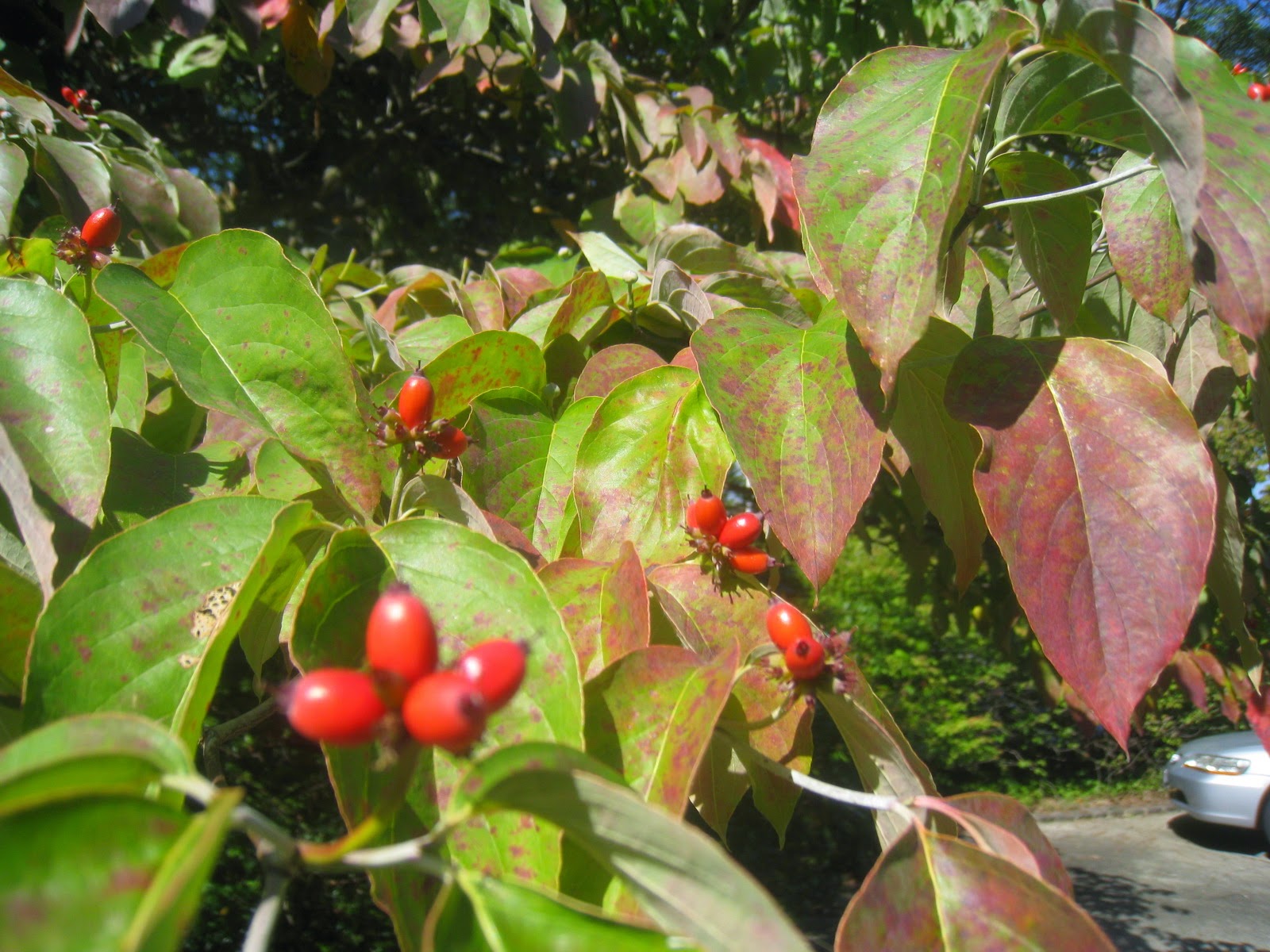 Dogwood leaves are changing quickly now, among the first, and in a few weeks will be brown and on the ground. The bright red fruit is ofte