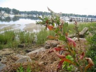 Even the grubbiest weeds can get into the act, turning brilliant colors before the trees, unexpectedly gleaming counterpoint in forgotten corners. Last week they were just more dull green junk in piles of more green junk, now they can play the part of jewels on a dress. By the time everything else kicks into color (making anything still green a welcome relief) these are just brown dead shriveled stalks, their purpose served.