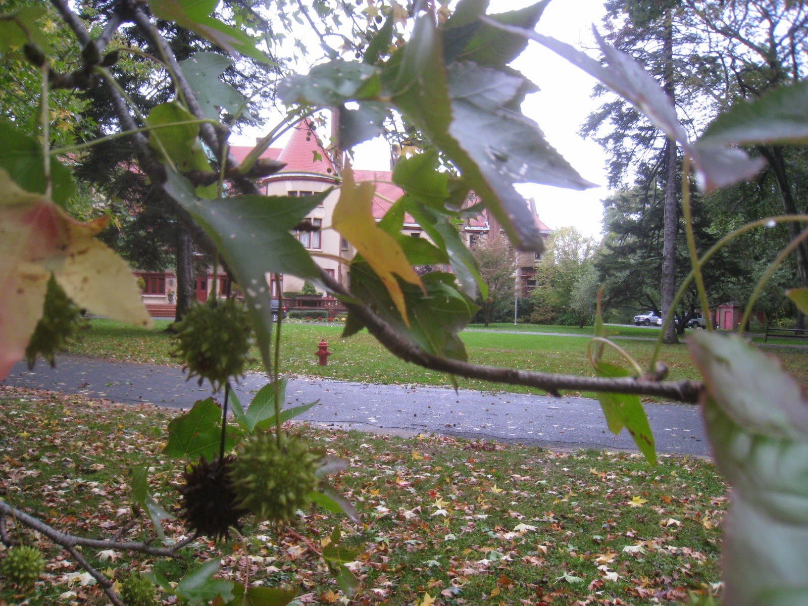 What look like elf weapons hanging from the sweet gum tree in front of Coindre Hall. These handsome leaves are moving right along with everything else. Today the wind has a bite _ I’m wearing a wool cap for the first time _ and there remains an off and on drizzle from the storm out over the Atlantic.