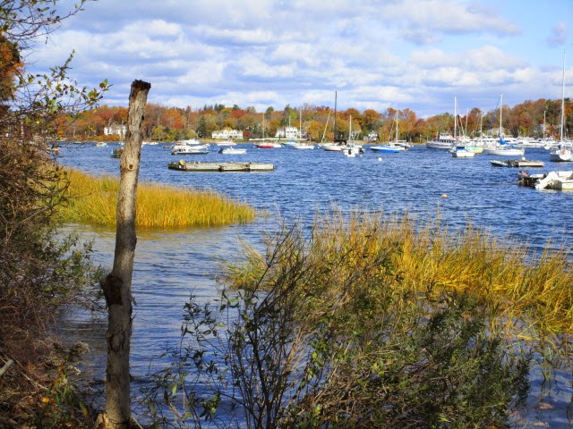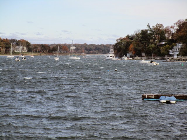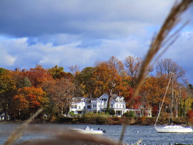 Pure November, across the wind-churned water to the deepening brown trees under a dark foreboding cloud-filled sky. Breaks of sunlight highlight a white mansion standing almost defiant against the coming elements. Of course, that is the normal romantic take on all this stuff. Otherwise, ho hum, another day, whatever.