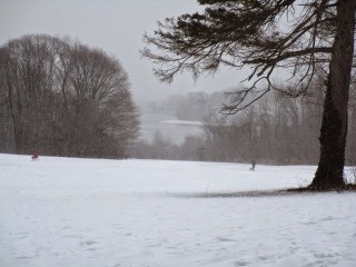Light snow has covered the world in beauty. Softly luminous light envelops harmonious whites and greys tinged with soft brown, accented by peeks of dark green. Flakes continue to fall, there is no time but now, nothing to do but enjoy the show.