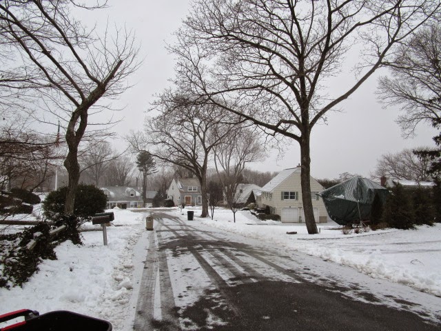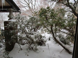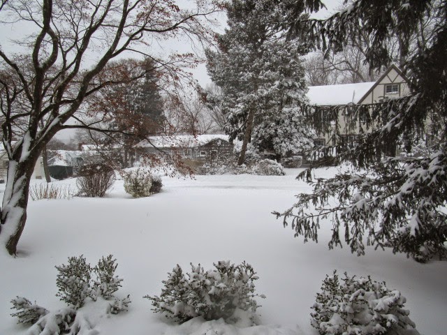 Early preliminary to major snowfall, wind picking up, moderate flakes off and on blurring the horizon. After dark, the wind picked up and this morning about 15 inches on the ground. Nothing too spectacular, as indicated by the second picture.