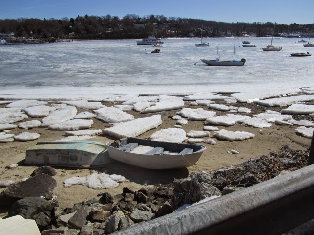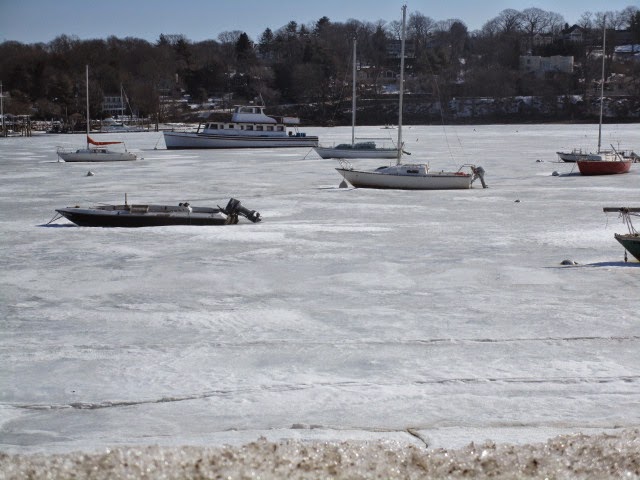 Yes, this represents melting and breakup, but it is late and the ice floats are so thick that boats still cannot punch their way through here nor on any of the other near bays. No icebreaker has been called, although I did see one frustrated clammer walking out to his boat and attempting to chop a passage out. A few less hardy boats have been crushed and sunk, only their masts showing through the crust.
