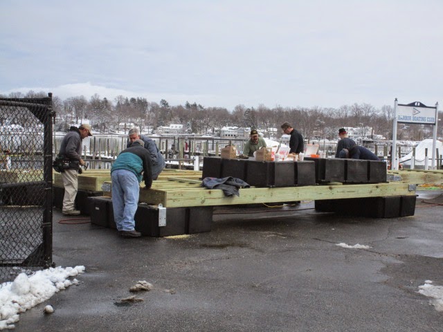 - March, like February, has been exceptionally frigid and snow filled. But as farmers always knew, there is no use waiting for weather to match mood. Chores must be done in anticipation of seasons, regardless of the day. So around here it is time for the docks to be repaired, or in this case rebuilt from scratch. The activity is not unlike that of little European fishing communities in the old days, each boat club and neighborhood pitching in on common work for a while. Up next, naturally, will be working on the boats themselves.