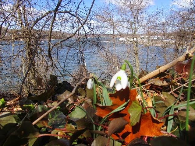 - Showdrops in leftover leaves, a couple selected from large clumps growing on the bluffs on the east shore. Beyond the bare vine network brilliant blue sky promises a lovely day. But this morning, the sun and wind are involved in a classic struggle recalling the old fable. Where the sun shines and the wind is blocked, hats and gloves come off, where the wind howls and the sun is shaded, covering head and hands is hardly enough. Looks beautiful, no matter what.