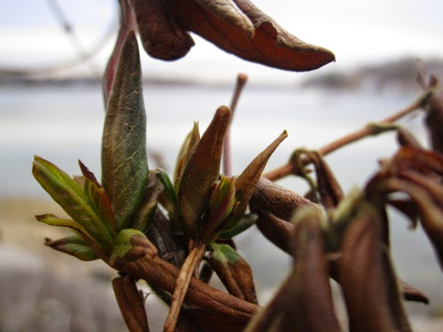- Sap rising, leaves unfurling on honeysuckle on the fence overlooking the inlet. Most of the tangle remains blasted and brown, but underneath the basic patterns and essentials remain, the spark survives, and miracles of near-resurrection occur once again. Every bit of new growth after such a long dormancy is a wonder and cause for rejoicing.
