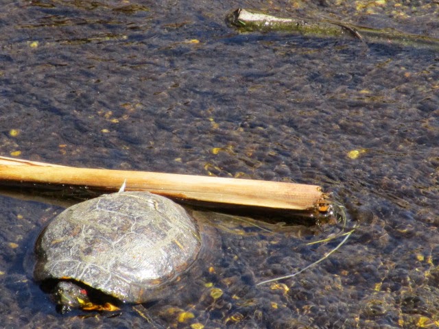 - At Hecksher park, turtles climb out of the pond to sun themselves on the banks of a few islands or swim slowly about, heads in the air. This one seems to be resting in a small stream, but as it never moved it’s hard to tell if it is really resting or dead. Seems a tragedy to make it through such a difficult winter, only to miss the spring, even for a turtle. Otherwise, except for the happy screams of herds of young children at the playground, only the warmer temperature gives strong hints that the season is finally progressing.