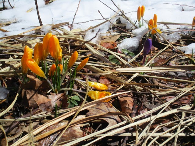 - First flowers, first honors. This clump by the harbor always seems to manage to push up yellow buds before other crocuses in more favored locations. Old leaves and remnants of last year’s flowers lie all around, soon to be cleaned up by the caretaker in a fit of spring fever. Certainly a cheery sight, on a cold day with overnight snow yet again.