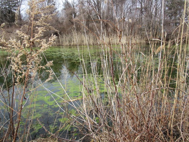 - April arrives looking pretty much as March did. The evergreens are bright and cheerful, but the only other real sight of green is this verdant scum on the pond at Coindre Hall. Most years it hasn’t shown up until much later, perhaps the underground water supply is warmer than usual. It does provide an interesting aesthetic harmony with the browns of the reeds and weeds. Nature always surprising and always correct in its artistic judgement.