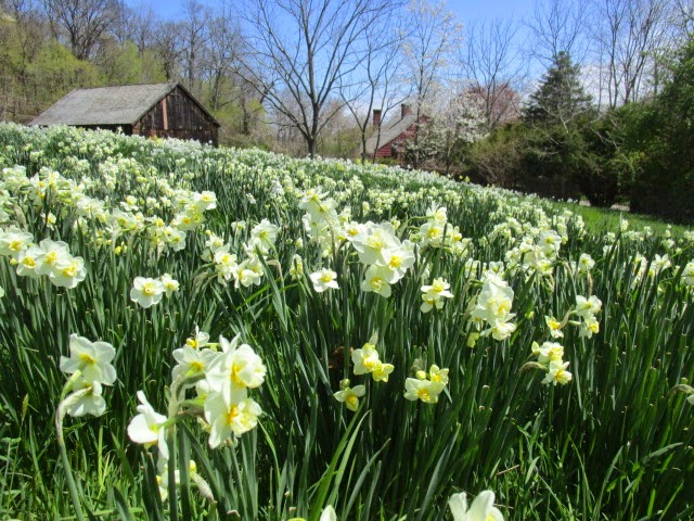• This scene at Caumsett State Park of the 1711 Lloyd House and 1756 barn reminds me of the William Wordsworth poem.  Vast fields of naturalized daffodils are a remarkable feast for the eyes _ a synopsis of my contradictory views of landscape.  The view pleases me far more than would virgin forest which originally occupied  these slopes.  Like Thoreau, I contemplate the intersection of humans and nature and universe; like him, from a safe, civilized, and long-tamed bit of property.