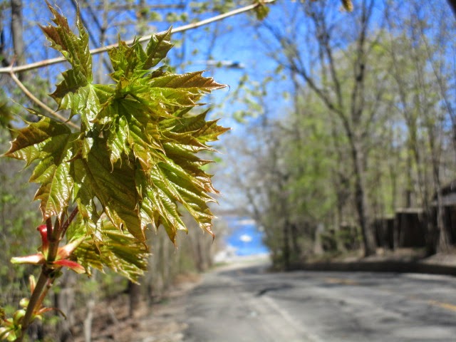 • Flowers get all the glory, but newly formed leaves have their own infinite range of crisp shapes and subtle varied hues.  Like an individual lost in a crowd, each leaf comes to mean almost nothing except as it contributes to the whole.  This maple cluster has dull red cotyledons, dark and light greens freshly glistening, sharp edges, and intricate origami folds.  In a day or so it will be _ just another unnoticed spot on one of the numerous trees along this road as cars race by.