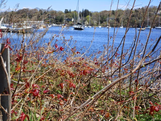 • This week, in particular, the scenery changes over the mile that I walk from the inlet to the head of harbor.  The inlet is exposed to the open sound, from whence have been blasting constant frigid winds rechilled by the large expanse of cold water.  When I start, up there, spring has hardly started, trees are bare branches, leaves are only unfurling grudgingly, if at all.  But by the time I have reached Mill Pond, everything is open, even most of the trees, and what is not completely covered by foliage is at least decently cloaked.  And should I venture further, into town, well,  anything not open is probably killed off by the winter.  Birds must experience amazing differences as they swiftly dart around.