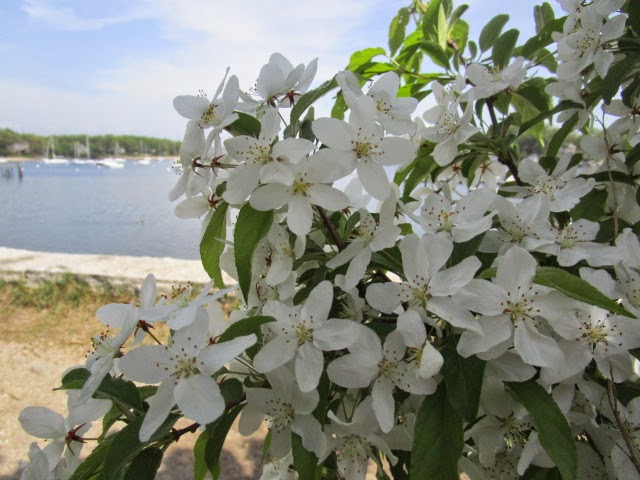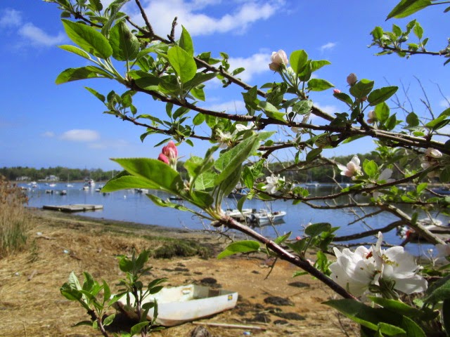 - Apple blossoms bursting on the only fruit tree along the waterfront. May is a romantic month, filled with hope and optimism, as nature seems to reconquer the whole world. Goslings have hatched, fish have spawned, every weed is leaping up in profusion, and grass seeks to cover everything with a mat of green. Besides, folks can walk around in shorts and tee shirts, happily unencumbered with the heavy detritus of the last few months.