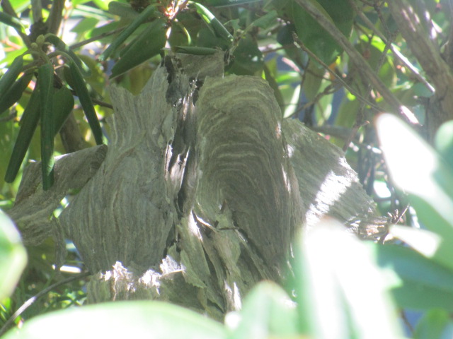 - Beehive in a shrub. Seems to be real bees, not wasps, hornets, or yellow-jackets. With all the flowers around the yards, bees are welcome sights. Industrious and important parts of any ecology, and severely threatened by pesticides, parasites, and other dangers in recent years. When there are lots of bees, it is easy to feel that things are right with the world.