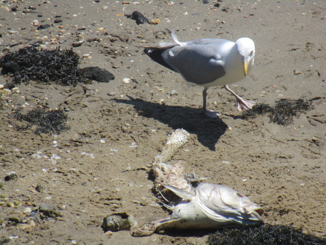 - Fat city for scavengers, wading birds, and others. Egrets pluck abundant minnows from the shallows, cormorants dive for minutes at time seeking slightly larger prey, this seagull feasts on a fish carcass thrown overboard after filleting (which is much better than sending it to the town dump.) The size of the head indicates it was taken in the open Sound, just a short trip past the inlet. Amazing that such remain relatively abundant.