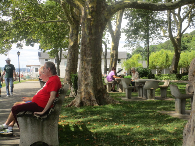• This scene from Northport looks like an impressionist painting of the Paris Tuilleries.  People sitting, talking, eating, walking dogs, and mostly watching other people accented by brilliant harbor background.  In times of incessant  electronic immersion, it’s comforting that ancient human patterns and behaviors can sometimes prevail.  Probably people have gathered thus in beautiful places forever.