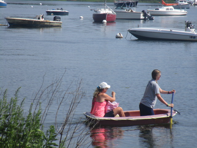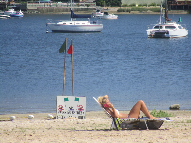 • A long spell with temperatures near ninety every day, some with breezes some calm, scorching sun.  Kids and many adults on vacation.  Water has heated up nicely: even on Monday beaches are crowded, various craft cram the waterways, and children play at catching crabs and chasing minnows with nets.  Early in the day, on a low tide, there is still some solitude to be found.