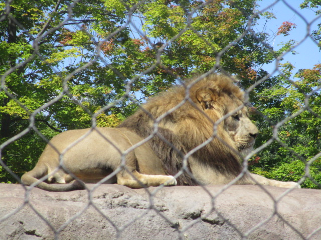 - Rochester’s Seneca Park Zoo is smaller than Huntington’s (18 acre) Hecksher, but manages to contain _ in addition to the usual suspects (monkeys, sea lions, snakes, fish, birds) _ a snow leopard, an Asian tiger, a white rhino, two polar bears, four elephants, and three lions. Here the king of beasts surveys the fat luscious snacks parading below him. In another area a bald eagle, probably injured with flight feathers clipped, preens alongside a pond.